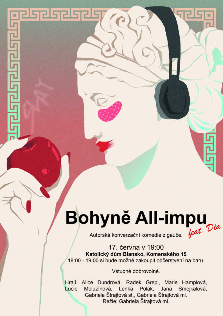 Autorská konverzační komedie, která spojuje čtyři řecké báje pod dohledem investigativní novinářky Hery představené diváku takříkajíc z gauče. Inscenace měla úspěch a nabídli jsme ji nejen v Blansku, Boskovicích, Lažánkách, ale v letošním roce 2026 ji představíme v Zakrejsově Poličce na festivalu divadel.